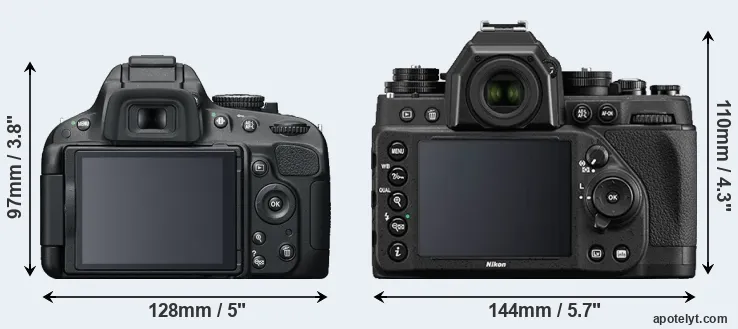 If the front view area (width x height) of the cameras is taken as an aggregate measure of their size, the Nikon Df is notably larger (28 percent) than the Nikon D5100. Moreover, the Df is substantially heavier (36 percent) than the D5100. It is noteworthy in this context that the Df is splash and dust-proof, while the D5100 does not feature any corresponding weather-sealing.