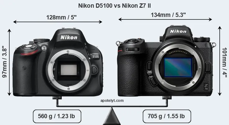 The side-by-side display below illustrates the physical size and weight of the Nikon D5100 and the Nikon Z7 II. The two cameras are presented according to their relative size. Three consecutive perspectives from the front, the top, and the back are available. All width, height and depth measures are rounded to the nearest millimeter.