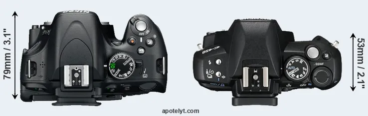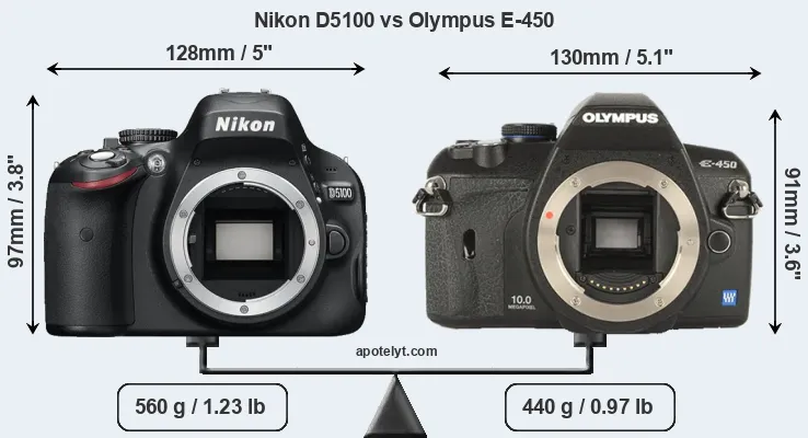 The physical size and weight of the Nikon D5100 and the Olympus E-450 are illustrated in the side-by-side display below. The two cameras are presented according to their relative size. Three consecutive perspectives from the front, the top, and the back are available. All size dimensions are rounded to the nearest millimeter.
