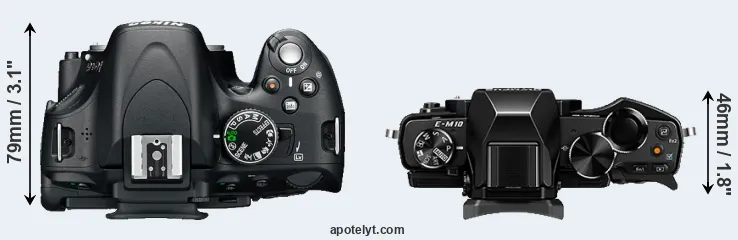 The physical size and weight of the Nikon D5100 and the Olympus E-M10 are illustrated in the side-by-side display below. The two cameras are presented according to their relative size. Three consecutive views from the front, the top, and the rear side are shown. All width, height and depth dimensions are rounded to the nearest millimeter.
