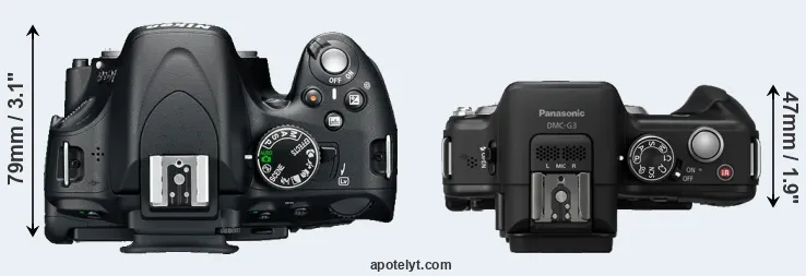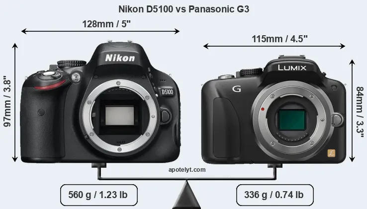 The side-by-side display below illustrates the physical size and weight of the Nikon D5100 and the Panasonic G3. The two cameras are presented according to their relative size. Three successive views from the front, the top, and the rear are shown. All width, height and depth measures are rounded to the nearest millimeter.