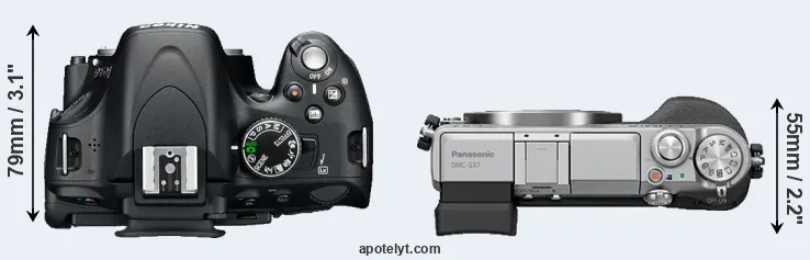 An illustration of the physical size and weight of the Nikon D5100 and the Panasonic GX7 is provided in the side-by-side display below. The two cameras are presented according to their relative size. Three consecutive perspectives from the front, the top, and the back are available. All size dimensions are rounded to the nearest millimeter.