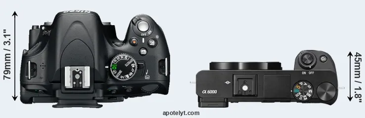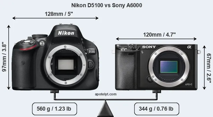 An illustration of the physical size and weight of the Nikon D5100 and the Sony A6000 is provided in the side-by-side display below. The two cameras are presented according to their relative size. Three successive views from the front, the top, and the rear are shown. All size dimensions are rounded to the nearest millimeter.