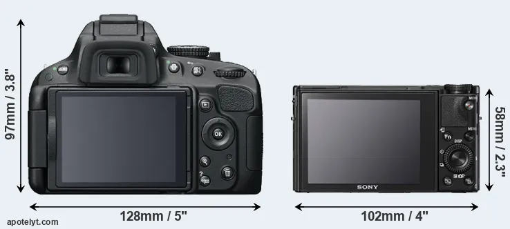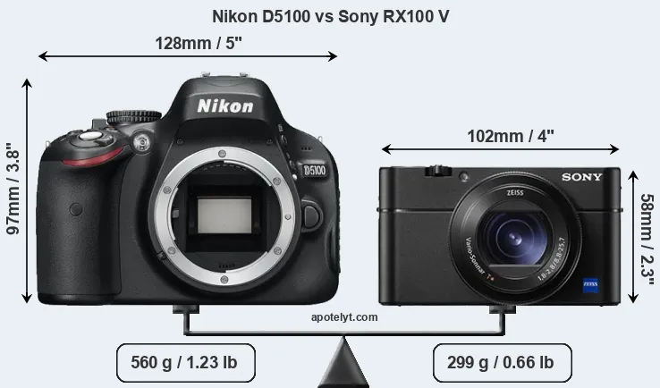 An illustration of the physical size and weight of the Nikon D5100 and the Sony RX100 V is provided in the side-by-side display below. The two cameras are presented according to their relative size. Three consecutive perspectives from the front, the top, and the back are available. All size dimensions are rounded to the nearest millimeter.