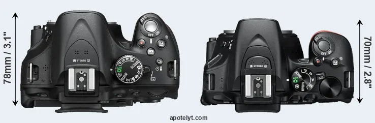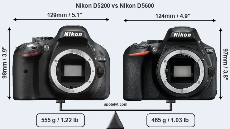 The physical size and weight of the Nikon D5200 and the Nikon D5600 are illustrated in the side-by-side display below. The two cameras are presented according to their relative size. Three consecutive perspectives from the front, the top, and the back are available. All width, height and depth measures are rounded to the nearest millimeter.