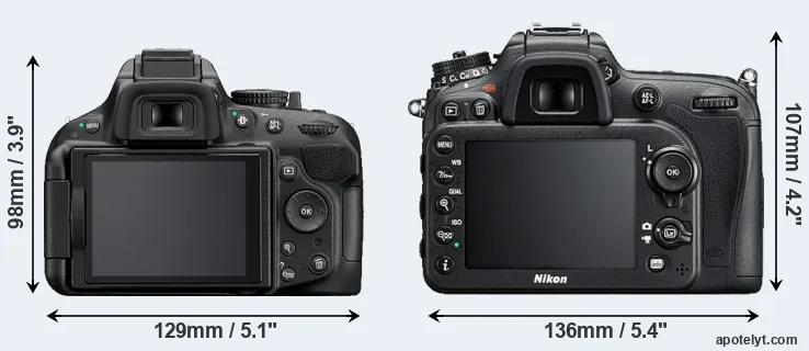 If the front view area (width x height) of the cameras is taken as an aggregate measure of their size, the Nikon D7200 is notably larger (15 percent) than the Nikon D5200. Moreover, the D7200 is substantially heavier (38 percent) than the D5200. It is noteworthy in this context that the D7200 is splash and dust-proof, while the D5200 does not feature any corresponding weather-sealing.