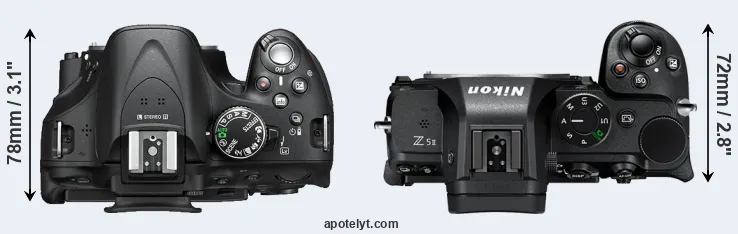 An illustration of the physical size and weight of the Nikon D5200 and the Nikon Z5 II is provided in the side-by-side display below. The two cameras are presented according to their relative size. Three consecutive perspectives from the front, the top, and the back are available. All width, height and depth dimensions are rounded to the nearest millimeter.