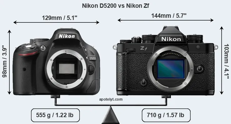 If the front view area (width x height) of the cameras is taken as an aggregate measure of their size, the Nikon Zf is notably larger (17 percent) than the Nikon D5200. Moreover, the Zf is markedly heavier (28 percent) than the D5200. It is noteworthy in this context that the Zf is splash and dust-proof, while the D5200 does not feature any corresponding weather-sealing.
