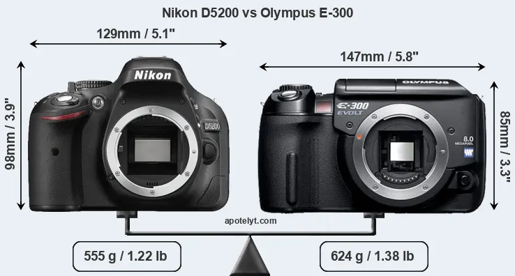 The physical size and weight of the Nikon D5200 and the Olympus E-300 are illustrated in the side-by-side display below. The two cameras are presented according to their relative size. Three consecutive views from the front, the top, and the rear side are shown. All width, height and depth dimensions are rounded to the nearest millimeter.