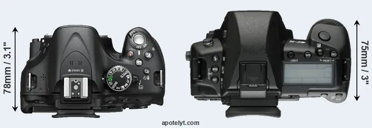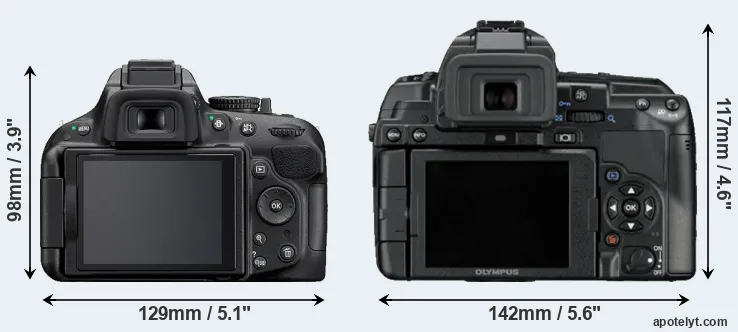 The side-by-side display below illustrates the physical size and weight of the Nikon D5200 and the Olympus E-5. The two cameras are presented according to their relative size. Three consecutive perspectives from the front, the top, and the back are available. All width, height and depth dimensions are rounded to the nearest millimeter.