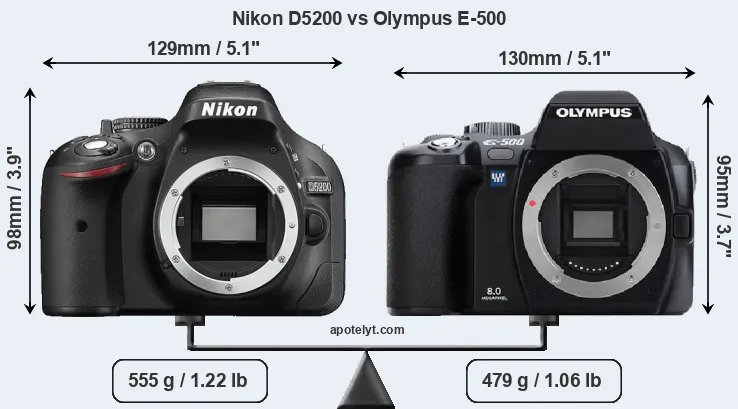 If the front view area (width x height) of the cameras is taken as an aggregate measure of their size, the Olympus E-500 is somewhat smaller (2 percent) than the Nikon D5200. Moreover, the E-500 is markedly lighter (14 percent) than the D5200. In this context, it is worth noting that neither the D5200 nor the E-500 are weather-sealed.