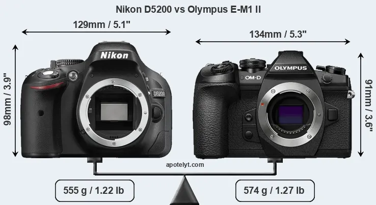The side-by-side display below illustrates the physical size and weight of the Nikon D5200 and the Olympus E-M1 II. The two cameras are presented according to their relative size. Three consecutive perspectives from the front, the top, and the back are available. All width, height and depth dimensions are rounded to the nearest millimeter.