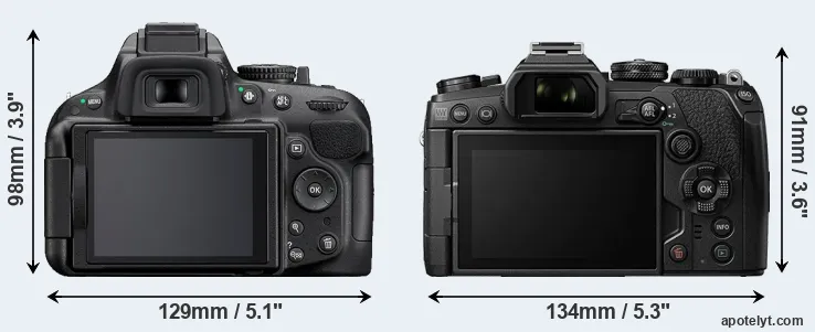 The side-by-side display below illustrates the physical size and weight of the Nikon D5200 and the Olympus E-M1 III. The two cameras are presented according to their relative size. Three consecutive perspectives from the front, the top, and the back are available. All width, height and depth dimensions are rounded to the nearest millimeter.