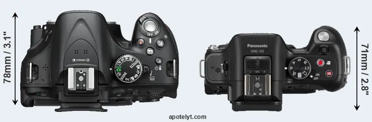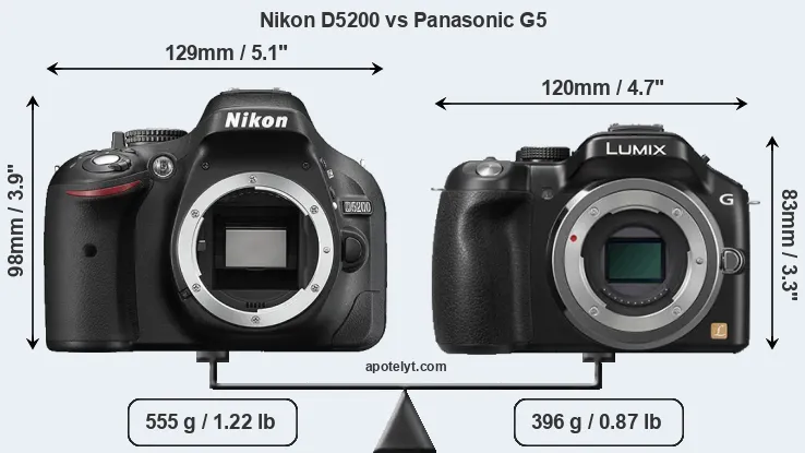 The side-by-side display below illustrates the physical size and weight of the Nikon D5200 and the Panasonic G5. The two cameras are presented according to their relative size. Three consecutive views from the front, the top, and the rear side are shown. All width, height and depth dimensions are rounded to the nearest millimeter.