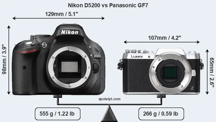 The physical size and weight of the Nikon D5200 and the Panasonic GF7 are illustrated in the side-by-side display below. The two cameras are presented according to their relative size. Three consecutive views from the front, the top, and the rear side are shown. All size dimensions are rounded to the nearest millimeter.
