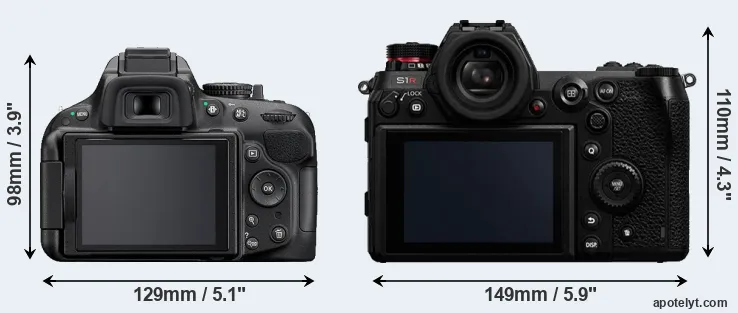 If the front view area (width x height) of the cameras is taken as an aggregate measure of their size, the Panasonic S1R is notably larger (30 percent) than the Nikon D5200. Moreover, the S1R is substantially heavier (83 percent) than the D5200. It is noteworthy in this context that the S1R is splash and dust-proof, while the D5200 does not feature any corresponding weather-sealing.