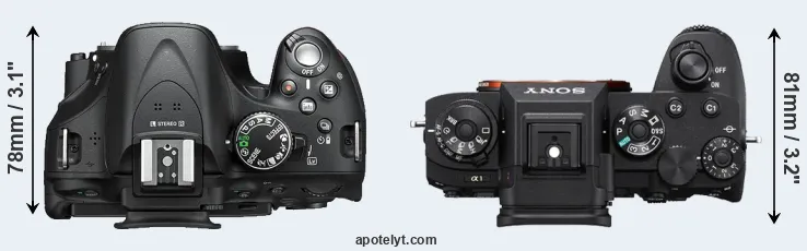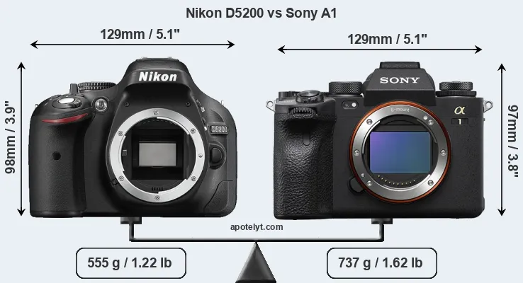 An illustration of the physical size and weight of the Nikon D5200 and the Sony A1 is provided in the side-by-side display below. The two cameras are presented according to their relative size. Three consecutive views from the front, the top, and the rear side are shown. All size dimensions are rounded to the nearest millimeter.