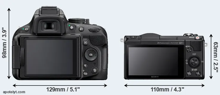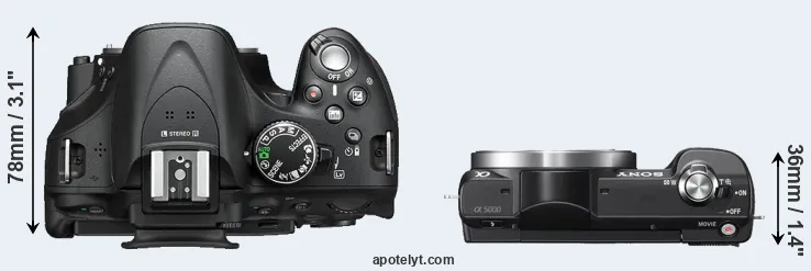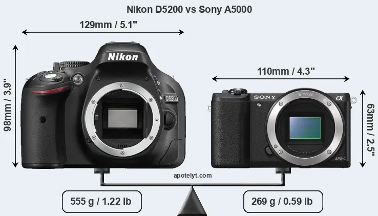The side-by-side display below illustrates the physical size and weight of the Nikon D5200 and the Sony A5000. The two cameras are presented according to their relative size. Three consecutive perspectives from the front, the top, and the back are available. All size dimensions are rounded to the nearest millimeter.