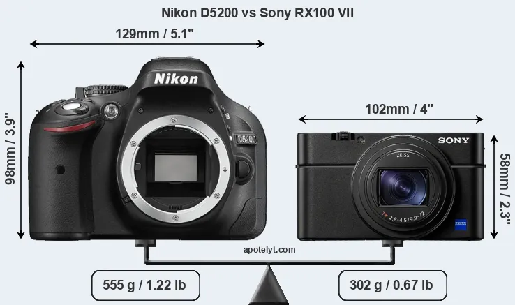 The physical size and weight of the Nikon D5200 and the Sony RX100 VII are illustrated in the side-by-side display below. The two cameras are presented according to their relative size. Three consecutive views from the front, the top, and the rear side are shown. All width, height and depth measures are rounded to the nearest millimeter.