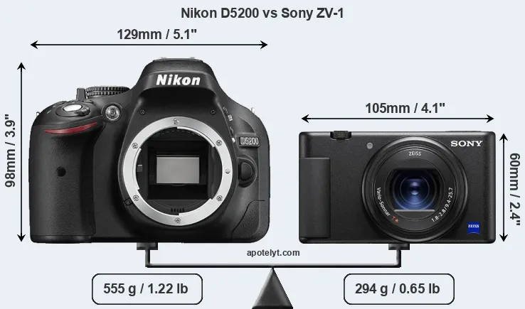 An illustration of the physical size and weight of the Nikon D5200 and the Sony ZV-1 is provided in the side-by-side display below. The two cameras are presented according to their relative size. Three consecutive views from the front, the top, and the rear side are shown. All width, height and depth measures are rounded to the nearest millimeter.