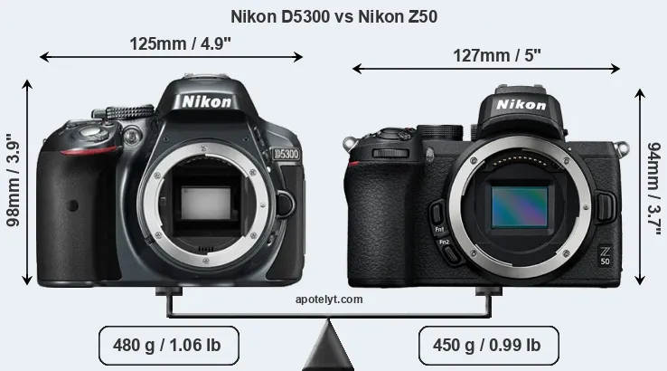 An illustration of the physical size and weight of the Nikon D5300 and the Nikon Z50 is provided in the side-by-side display below. The two cameras are presented according to their relative size. Three consecutive perspectives from the front, the top, and the back are available. All width, height and depth measures are rounded to the nearest millimeter.