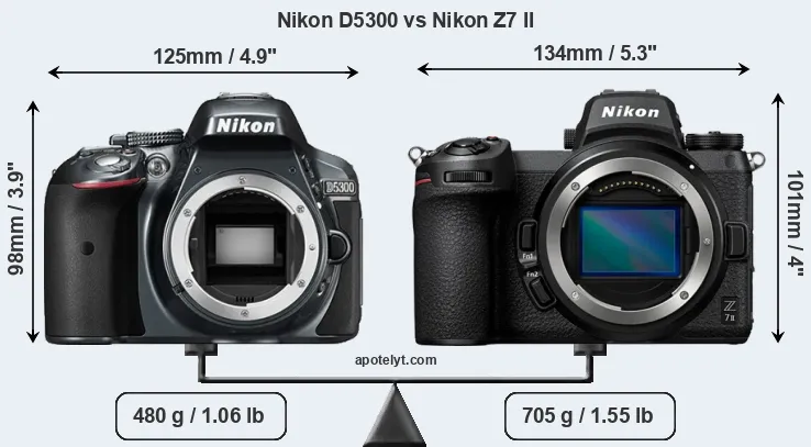 The side-by-side display below illustrates the physical size and weight of the Nikon D5300 and the Nikon Z7 II. The two cameras are presented according to their relative size. Three successive views from the front, the top, and the rear are shown. All width, height and depth measures are rounded to the nearest millimeter.