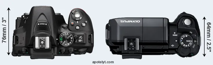 The physical size and weight of the Nikon D5300 and the Olympus E-300 are illustrated in the side-by-side display below. The two cameras are presented according to their relative size. Three consecutive perspectives from the front, the top, and the back are available. All width, height and depth measures are rounded to the nearest millimeter.