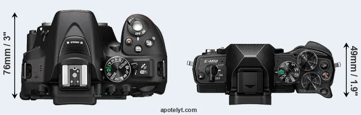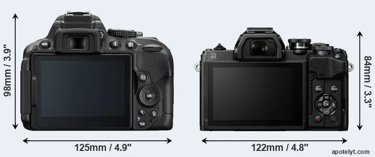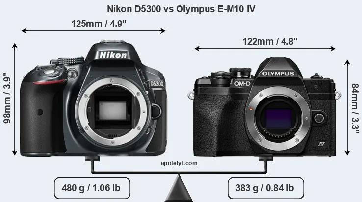The side-by-side display below illustrates the physical size and weight of the Nikon D5300 and the Olympus E-M10 IV. The two cameras are presented according to their relative size. Three consecutive perspectives from the front, the top, and the back are available. All width, height and depth measures are rounded to the nearest millimeter.