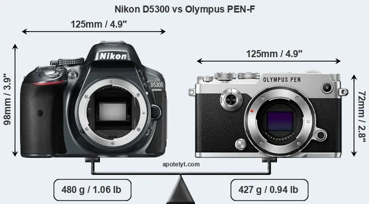 An illustration of the physical size and weight of the Nikon D5300 and the Olympus PEN-F is provided in the side-by-side display below. The two cameras are presented according to their relative size. Three consecutive views from the front, the top, and the rear side are shown. All width, height and depth measures are rounded to the nearest millimeter.