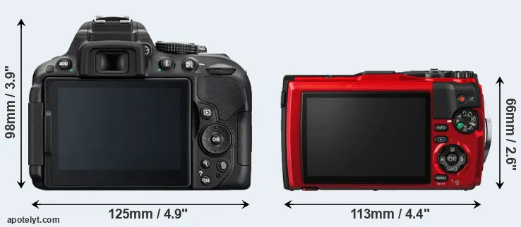 The side-by-side display below illustrates the physical size and weight of the Nikon D5300 and the Olympus TG-5. The two cameras are presented according to their relative size. Three consecutive perspectives from the front, the top, and the back are available. All size dimensions are rounded to the nearest millimeter.