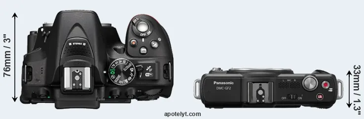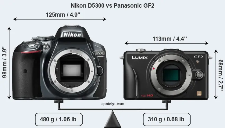 The physical size and weight of the Nikon D5300 and the Panasonic GF2 are illustrated in the side-by-side display below. The two cameras are presented according to their relative size. Three consecutive perspectives from the front, the top, and the back are available. All width, height and depth dimensions are rounded to the nearest millimeter.