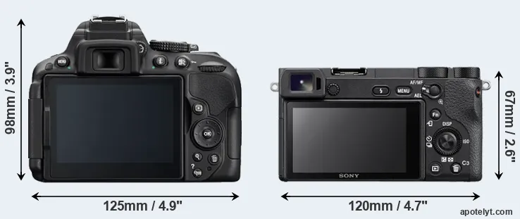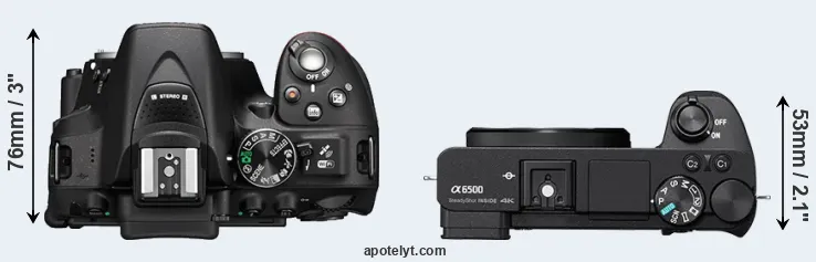 The physical size and weight of the Nikon D5300 and the Sony A6500 are illustrated in the side-by-side display below. The two cameras are presented according to their relative size. Three successive views from the front, the top, and the rear are shown. All width, height and depth dimensions are rounded to the nearest millimeter.