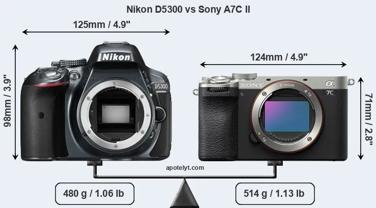 The physical size and weight of the Nikon D5300 and the Sony A7C II are illustrated in the side-by-side display below. The two cameras are presented according to their relative size. Three successive views from the front, the top, and the rear are shown. All width, height and depth measures are rounded to the nearest millimeter.