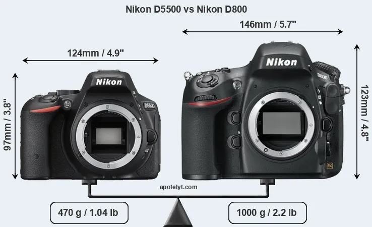 If the front view area (width x height) of the cameras is taken as an aggregate measure of their size, the Nikon D800 is considerably larger (49 percent) than the Nikon D5500. Moreover, the D800 is substantially heavier (113 percent) than the D5500. It is noteworthy in this context that the D800 is splash and dust-proof, while the D5500 does not feature any corresponding weather-sealing.
