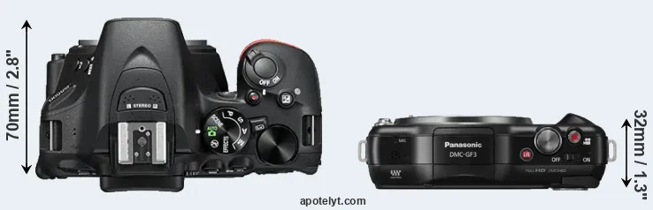 An illustration of the physical size and weight of the Nikon D5500 and the Panasonic GF3 is provided in the side-by-side display below. The two cameras are presented according to their relative size. Three consecutive views from the front, the top, and the rear side are shown. All width, height and depth measures are rounded to the nearest millimeter.