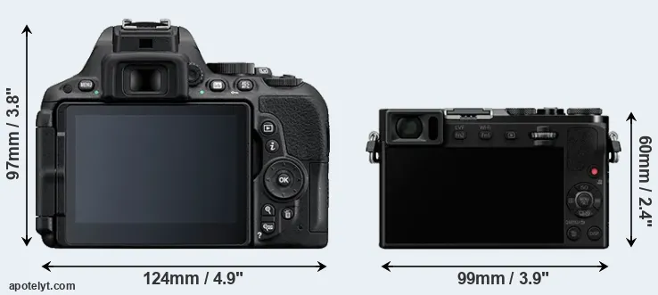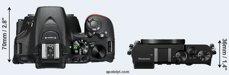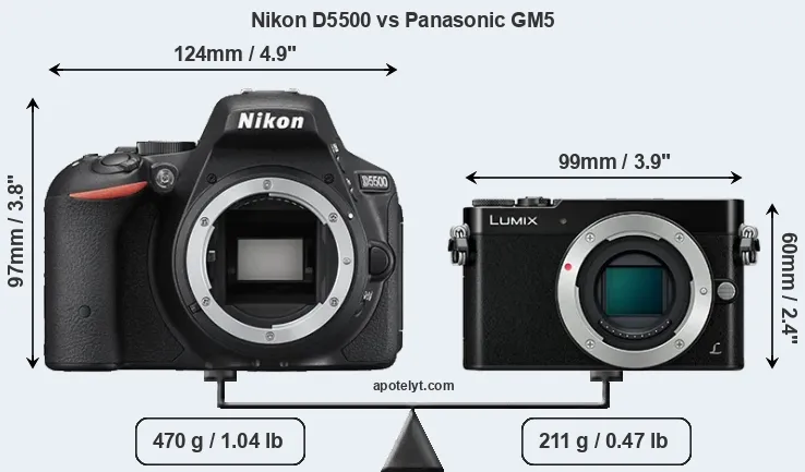 The physical size and weight of the Nikon D5500 and the Panasonic GM5 are illustrated in the side-by-side display below. The two cameras are presented according to their relative size. Three consecutive perspectives from the front, the top, and the back are available. All width, height and depth measures are rounded to the nearest millimeter.