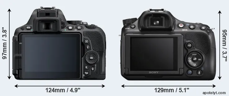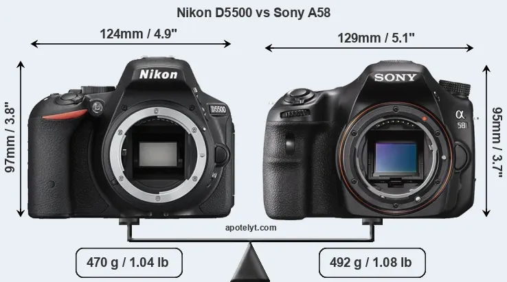 The side-by-side display below illustrates the physical size and weight of the Nikon D5500 and the Sony A58. The two cameras are presented according to their relative size. Three successive views from the front, the top, and the rear are shown. All width, height and depth dimensions are rounded to the nearest millimeter.