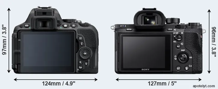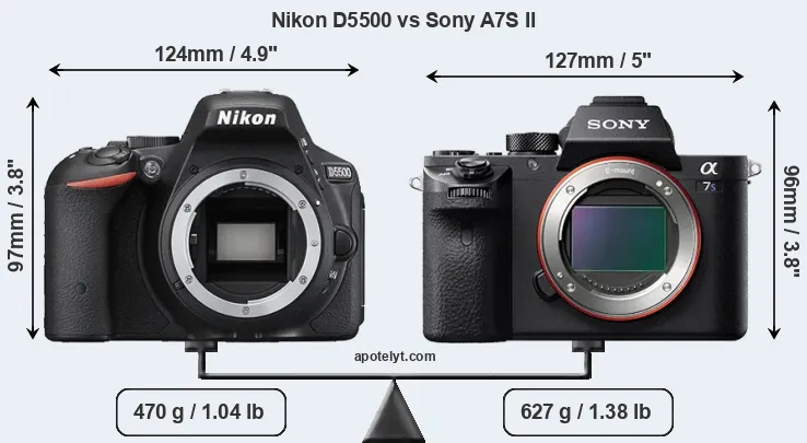If the front view area (width x height) of the cameras is taken as an aggregate measure of their size, the Sony A7S II is somewhat larger (1 percent) than the Nikon D5500. Moreover, the A7S II is markedly heavier (33 percent) than the D5500. It is noteworthy in this context that the A7S II is splash and dust-proof, while the D5500 does not feature any corresponding weather-sealing.