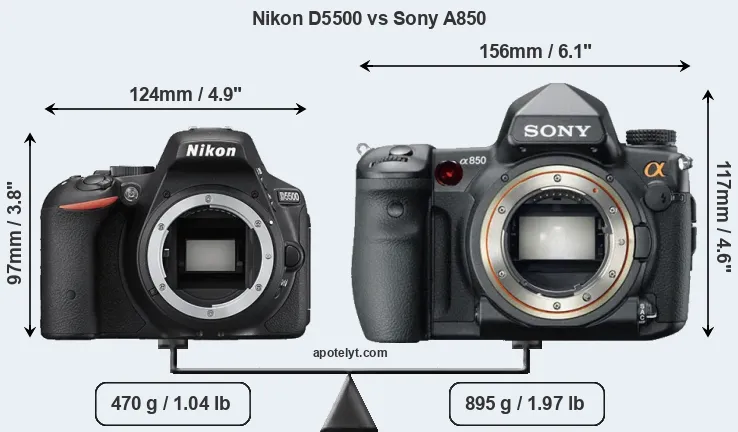 The side-by-side display below illustrates the physical size and weight of the Nikon D5500 and the Sony A850. The two cameras are presented according to their relative size. Three successive views from the front, the top, and the rear are shown. All width, height and depth dimensions are rounded to the nearest millimeter.