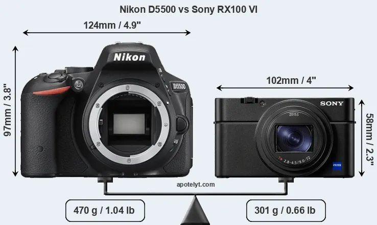 If the front view area (width x height) of the cameras is taken as an aggregate measure of their size, the Sony RX100 VI is considerably smaller (51 percent) than the Nikon D5500. In this context, it is worth noting that neither the D5500 nor the RX100 VI are weather-sealed.