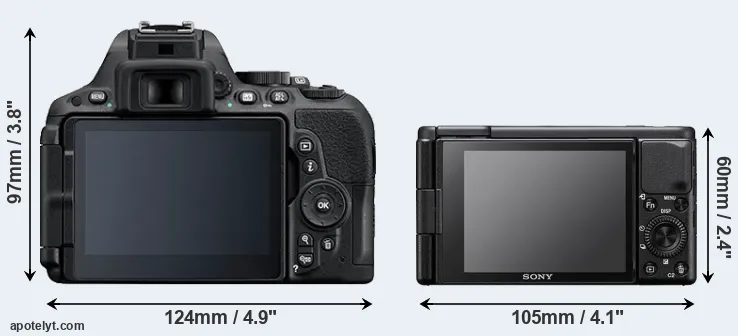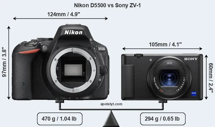 An illustration of the physical size and weight of the Nikon D5500 and the Sony ZV-1 is provided in the side-by-side display below. The two cameras are presented according to their relative size. Three consecutive perspectives from the front, the top, and the back are available. All size dimensions are rounded to the nearest millimeter.
