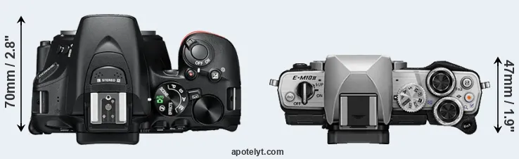 The physical size and weight of the Nikon D5600 and the Olympus E-M10 II are illustrated in the side-by-side display below. The two cameras are presented according to their relative size. Three consecutive views from the front, the top, and the rear side are shown. All size dimensions are rounded to the nearest millimeter.