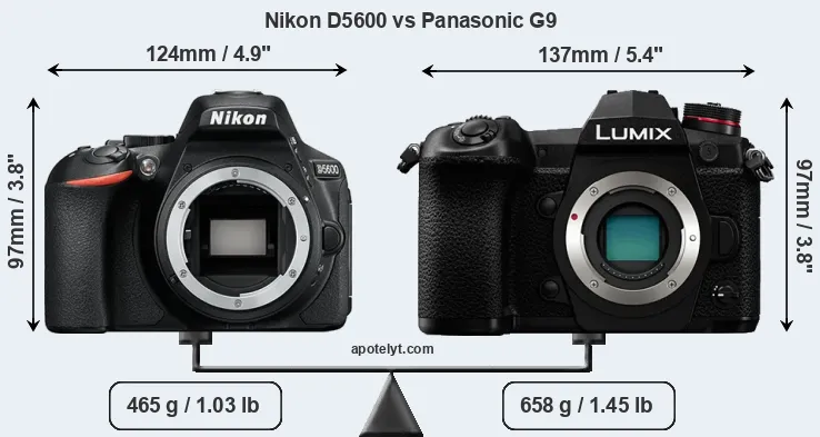 If the front view area (width x height) of the cameras is taken as an aggregate measure of their size, the Panasonic G9 is notably larger (10 percent) than the Nikon D5600. Moreover, the G9 is substantially heavier (42 percent) than the D5600. It is noteworthy in this context that the G9 is splash and dust-proof, while the D5600 does not feature any corresponding weather-sealing.