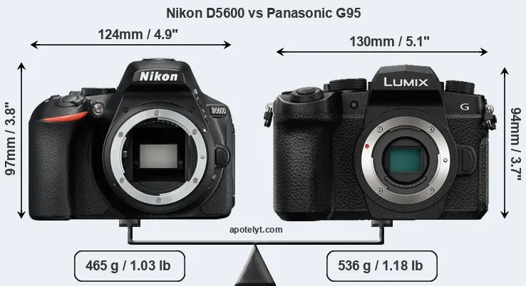 If the front view area (width x height) of the cameras is taken as an aggregate measure of their size, the Panasonic G95 is somewhat larger (2 percent) than the Nikon D5600. Moreover, the G95 is markedly heavier (15 percent) than the D5600. It is noteworthy in this context that the G95 is splash and dust-proof, while the D5600 does not feature any corresponding weather-sealing.