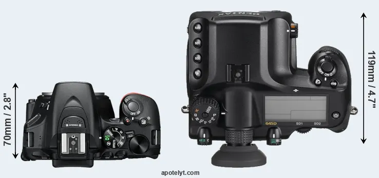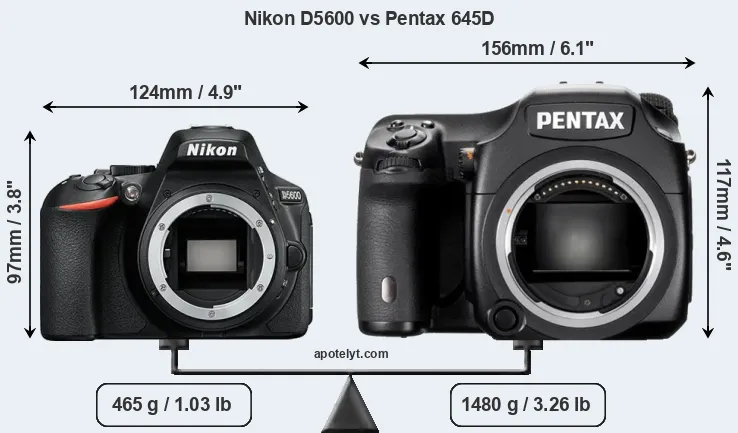 The physical size and weight of the Nikon D5600 and the Pentax 645D are illustrated in the side-by-side display below. The two cameras are presented according to their relative size. Three consecutive perspectives from the front, the top, and the back are available. All width, height and depth dimensions are rounded to the nearest millimeter.