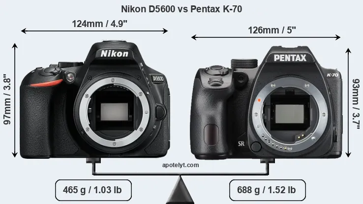 The physical size and weight of the Nikon D5600 and the Pentax K-70 are illustrated in the side-by-side display below. The two cameras are presented according to their relative size. Three consecutive perspectives from the front, the top, and the back are available. All width, height and depth dimensions are rounded to the nearest millimeter.