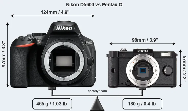 An illustration of the physical size and weight of the Nikon D5600 and the Pentax Q is provided in the side-by-side display below. The two cameras are presented according to their relative size. Three consecutive views from the front, the top, and the rear side are shown. All width, height and depth dimensions are rounded to the nearest millimeter.