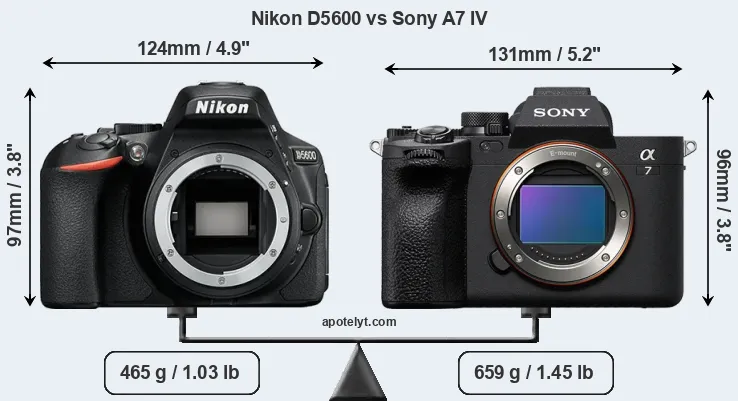 If the front view area (width x height) of the cameras is taken as an aggregate measure of their size, the Sony A7 IV is somewhat larger (5 percent) than the Nikon D5600. Moreover, the A7 IV is substantially heavier (42 percent) than the D5600. It is noteworthy in this context that the A7 IV is splash and dust-proof, while the D5600 does not feature any corresponding weather-sealing.