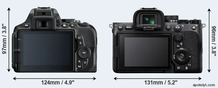 The side-by-side display below illustrates the physical size and weight of the Nikon D5600 and the Sony A7 IV. The two cameras are presented according to their relative size. Three consecutive views from the front, the top, and the rear side are shown. All width, height and depth dimensions are rounded to the nearest millimeter.