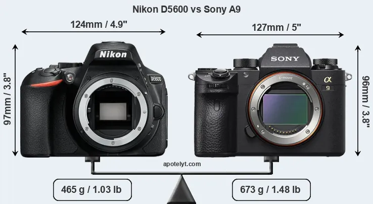 If the front view area (width x height) of the cameras is taken as an aggregate measure of their size, the Sony A9 is somewhat larger (1 percent) than the Nikon D5600. Moreover, the A9 is substantially heavier (45 percent) than the D5600. It is noteworthy in this context that the A9 is splash and dust-proof, while the D5600 does not feature any corresponding weather-sealing.